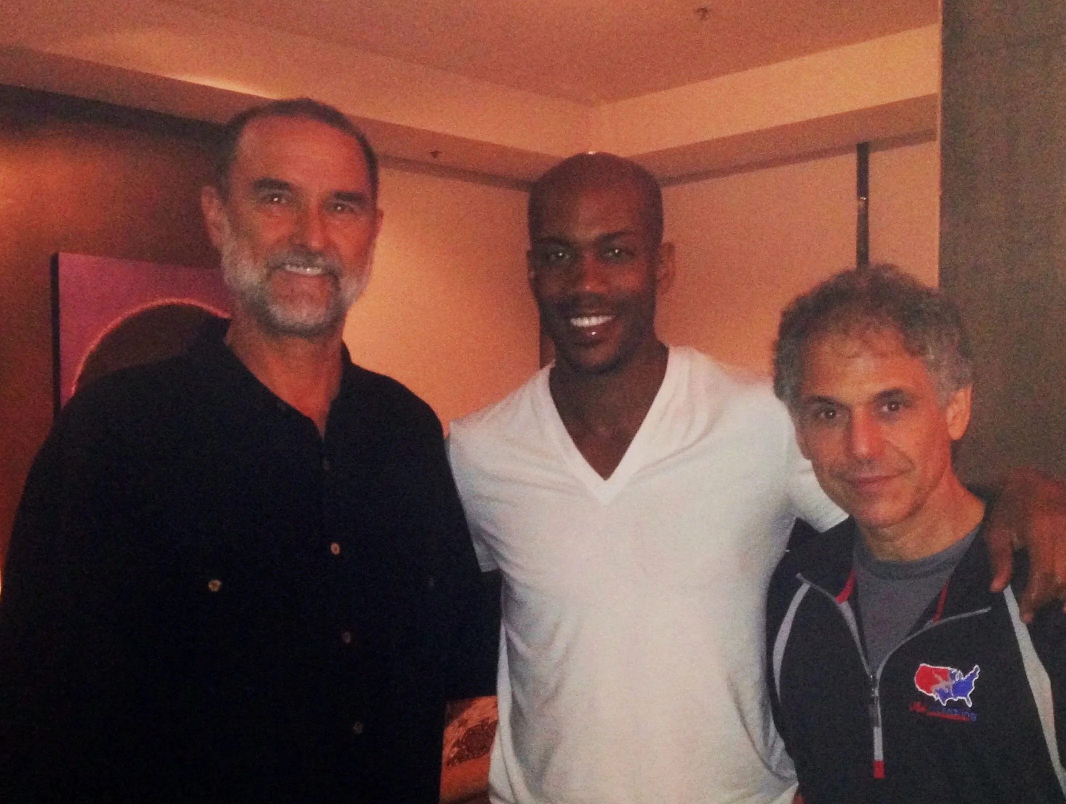 Richard Wickline (L), Stephon Marbury, and Anthony Hirschman (R) enjoy a moment together during their filming session. During the video shoot, Marbury discusses how using OPT's mental training system enabled his Beijing Ducks Chinese pro basketball team to win their second championship in three seasons. His Ducks won their third title the following year, with Marbury being voted Playoff MVP.