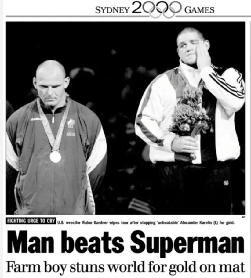 The next photo of Gardner and Karelin is from a newspaper headline immediately following their epic bout. The "Man Beats Superman" theme describes the “impossible” nature of Rulon's feat, as well as the subheading "Farm boy stuns world for gold on mat".