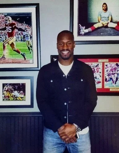 Vernon Davis’ standout playoff performances catalyzed the San Francisco 49ers’ return to relevancy (starting in 2011), after almost a decade of not even a single playoff appearance. That impact is apparent in this picture. He is standing in front of the 49ers’ Wall of Fame. Vernon’s action photo over his right shoulder has been strategically placed on the wall directly next to the Greatest Quarterback of the 20th Century, Joe Montana himself. No other 49ers player, past or present, was given that honor. Montana was voted by both the Associated Press and Sports Illustrated in 1999 to be the “Greatest Quarterback of the 20th Century.”