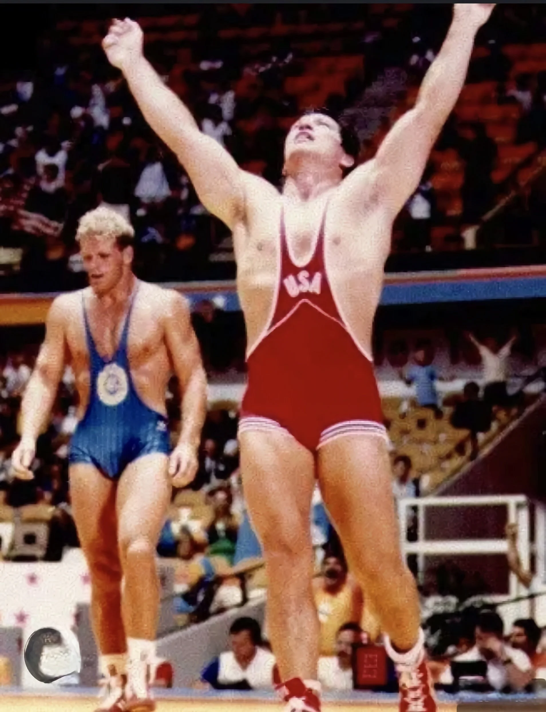 Somehow, in their gold medal match, Gardner prevailed...winning the most improbable Olympic wrestling championship ever. Sports Illustrated voted Karelin's 13-year win streak as one of the Ten Greatest Sports Streaks of the 20th Century...yet an athlete who had never even won a medal in World or Olympic competition (Gardner) beat him when it counted the most. The adjoining picture shows Gardner at the precise moment he had his hand raised in victory, with the gladiator he just defeated looking on in disbelief.
