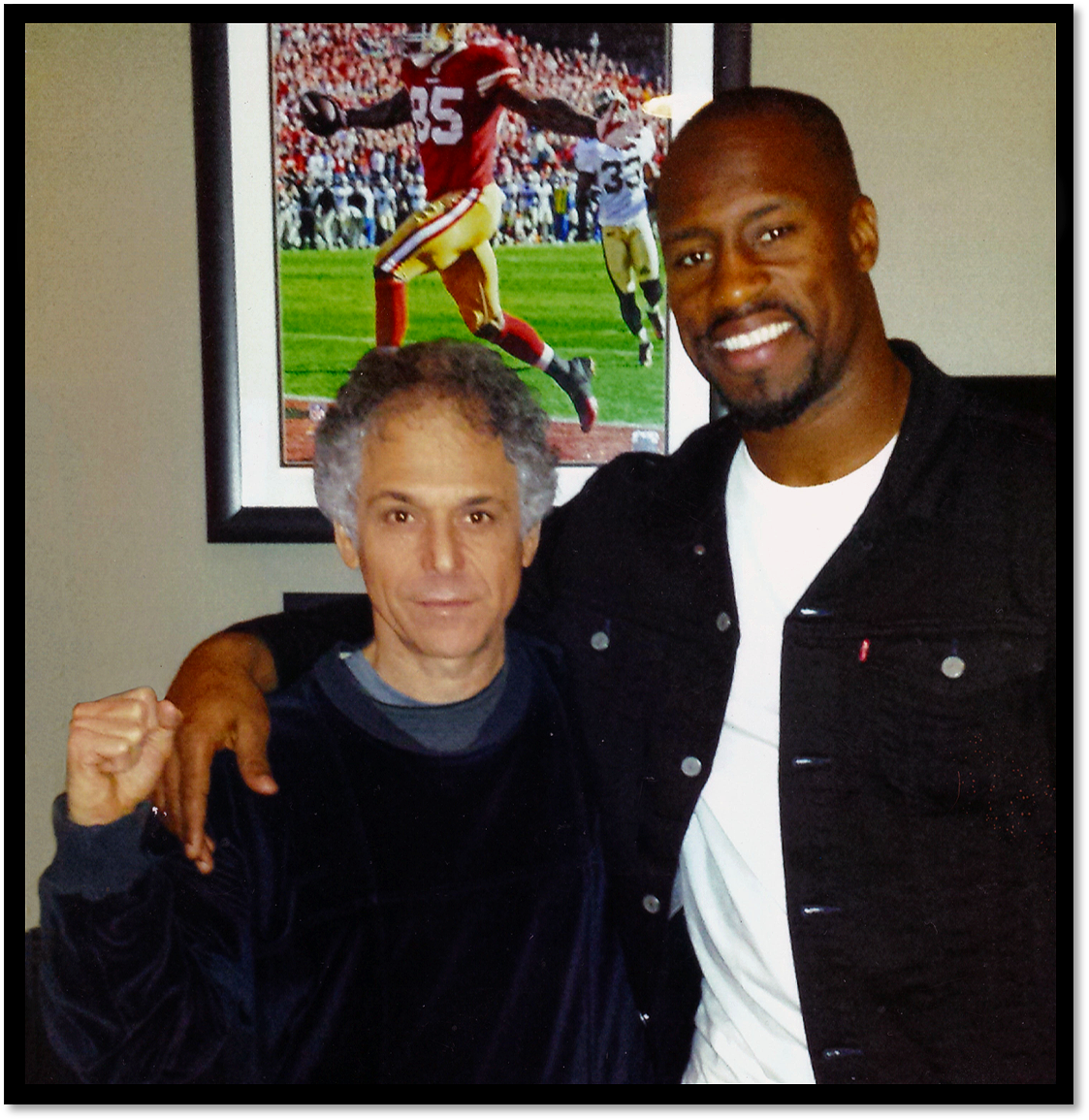 OPT Co-founder, Anthony Hirschman, is seen with Vernon Davis in front of the 49ers’ Wall of Fame at the team hotel in Santa Clara, California.