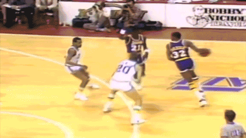 The live-action sequence above shows Magic Johnson passing the ball to Kareem Abdul-Jabbar during the 1984-85 NBA season.